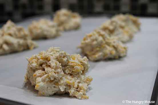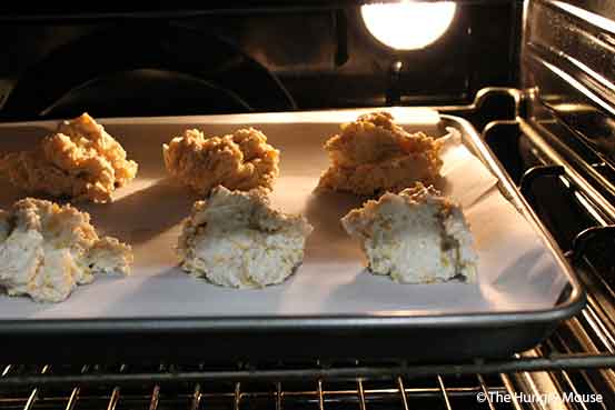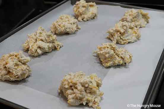 - Bake the biscuits: Grab two soup spoons. Scoop out a blob of dough on one spoon. Use the back of the other spoon to scrape it off and deposit it on your prepared sheet pan. Repeat til you've used all the dough.