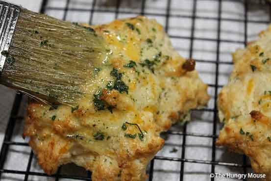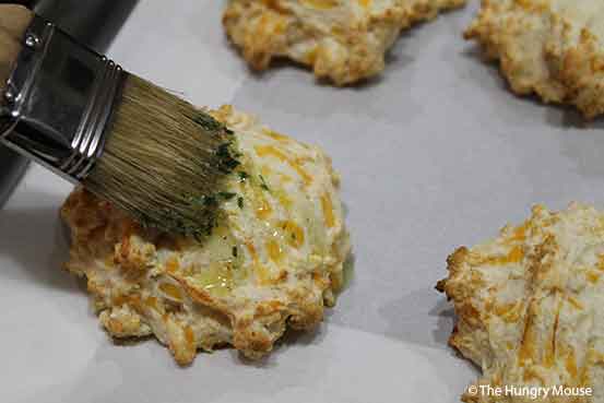 - After 10 minutes, yank the pan out of the oven onto a rack. Brush the top of each biscuit liberally with your butter glaze.